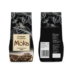 Cà phê bột hoặc hạt nguyên được đóng gói trong túi hoặc hộp có van 1 chiều để giữ hương thơm.